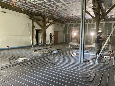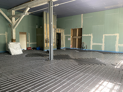 15.07.2021 Fußbodenheizung und Estricharbeiten im Veranstaltungsraum des Kühschiffs. |