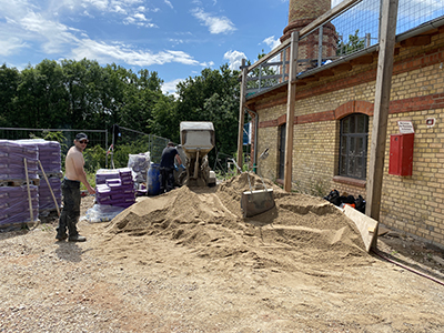 Vor dem Kesselhaus wird der Estrich "zubereitet". |