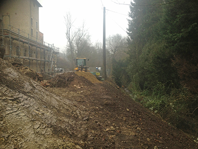 30.01.2020 Fertigbetonteile zur Abstützung der Terrasse im Bereich des Pferdestalls, schichtweise Aufschüttung und Verdichtung mit Erdmaterial. |