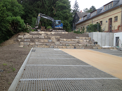 15./16.07.2020 Die neu gesetzten Stützmauerelemente an der Terrasse des Pferdestalls. |