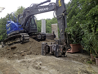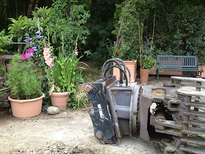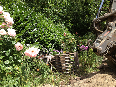 10./11.07.2020 Oberhalb der Parkplätze im Garten des Pferdestalls wartet der Bagger auf das notwendig gewordene, erneute Ausgraben der Betonstützmauerelemente. Diese waren abgesackt ... Solche Sensibilität lieben wir sehr: Mitten ins blühende Blumen- und Rosenbeet abgeworfene Baggerschaufel. |