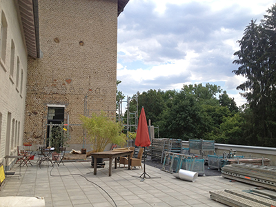 14.07.2020 Terrasse des Getreidelagers. Beginn der Einrüstung des Turms. |
