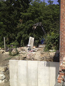 "Schlachtfeld" mit Aushub im Garten des Pferdestalls nach dem erneuten Ausgraben der bereits gesetzten aber abgesackten Betonstützmauerelemente. | |