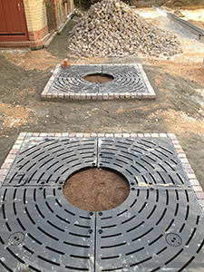 Pflanzmulden für Bäume und Anlage der Parkplatzmarkierungen. |