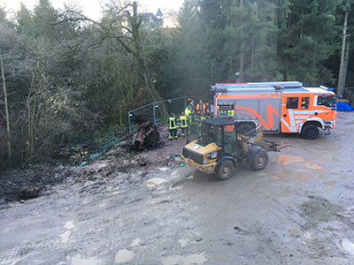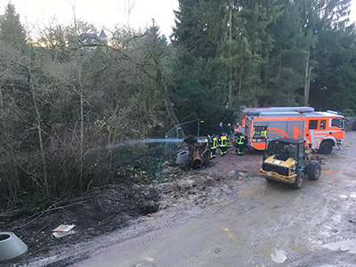 29.11.2017 Abnahme durch die Berufsfeuerwehr Wiesbaden: Die zahlreich auf der Südseite der Walkmühle unterirdisch gesetzten und miteinander verbundenen Löschwasserzisternen sind fertigestellt. Die Feuerwehr testet in einem letzten Schritt das System und die Löschwasserentnahme. |