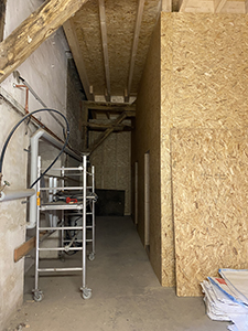 Kühlschiff: Beplankung der Holzständerkonstruktion mit OSB-Platten im Flur zu den späteren Toilettenanlagen und im Zwischenlager vor dem großen Veranstaltungsraum. |