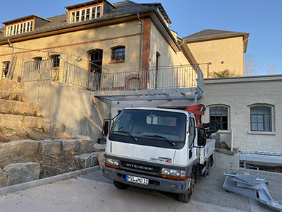 01.03.2021 Die Stahlbrücke zur Entfluchtung der Terrasse des Getreidelagers wird angeliefert und montiert. |