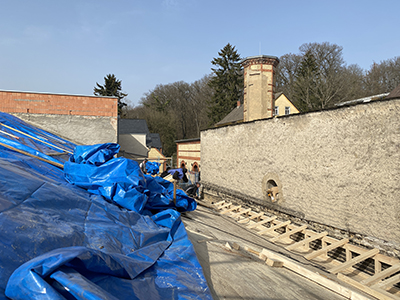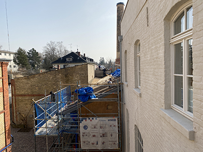 03.03.2021 Einrüstung der Giebelfassade des Pferdestalls. |