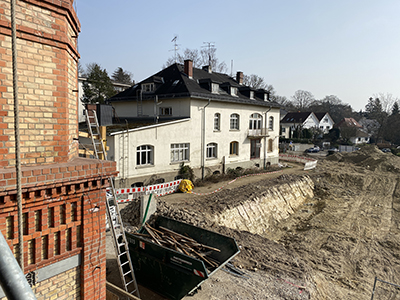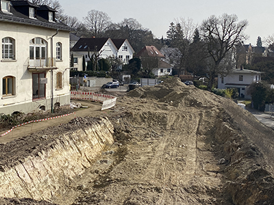 03.03.2021 Die Baugrube für die drei Neubauten zwischen oberer und unterer Zufahrt zur Walkmühle. |