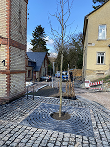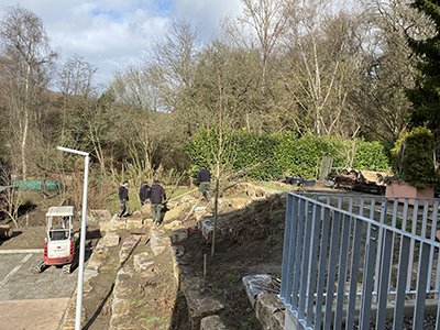 Ein neuer Ahorn wird am Hang unterhalb des Pferdestalls gepflanzt. |