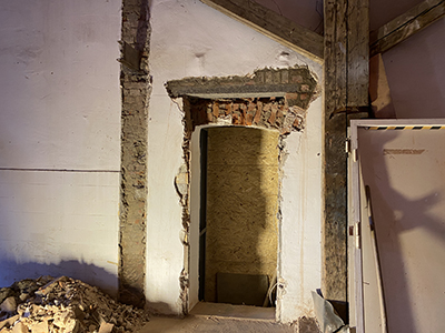 Links: Der noch verschlossene Durchgang zwischen großem Saal und Brauhaus. Rechts: Improvisierte Sitzecke für Pause der Trockenbauer. |