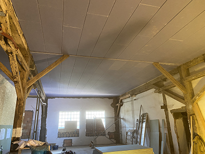 Die beplankte Holzbalkendecke im großen Veranstltungsraum des Kühlschiffs. |