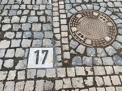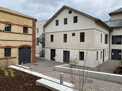 16.04.2021 Gepflasterte Bereiche und Parkplätze im Bereich vor dem Mühlengebäude und dem Pferdestall – mit neu angelegtem Hang. |