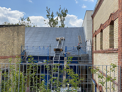 Dachdeckungsarbeiten am Kühlschiff. | ||