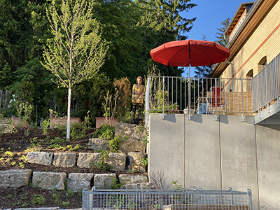 31.05.2021 Die neu gepflanzen Bäume und Sträucher am Hang unterhalb des Pferdestalls treiben aus. |