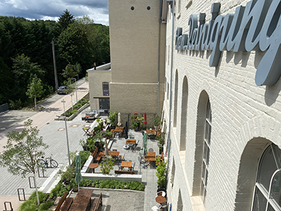 Blick auf das "Vinotto" und Holzverkleidung der östlichen Giebelfassade des Kühlschiffs. |