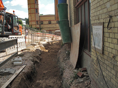 17.08.2017 Vorbereitungen für das Absanden der verlegten Heizungsleitungen im Versorgungsgraben am Sudhaus (links) und bereits abgesandeter Graben am Pferdestall. |