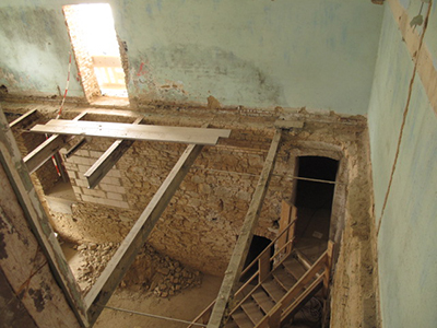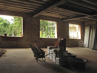 07.08.2017 Fertig aufgemauerte Fenstersimse und -wangen im zukünftigen Künstleratelier im Erdgeschoss des Malzhauses (links) und Blick im Obergeschoss zur Südseite. |