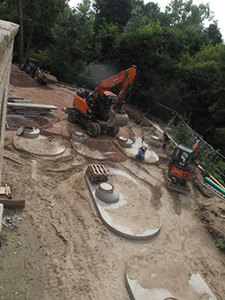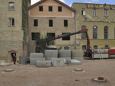 Erdreich und Schotter werden um die gesetzten Löschwasserzisternen aufgefüllt und verdichtet. |
