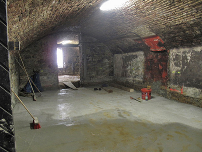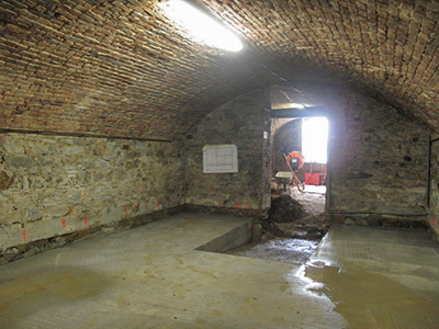 Im "Vinotto" sind die gewölbetragenden Säulen entfernt. Während vorne noch ausgeschachtet wird, ist im hinteren Gewölbe bereits die neue Fußbodenplatte gegossen. |