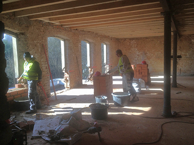 Estricharbeiten auf dem ausgebesserten Tonnengewölbe im Erdgeschoss des Südflügels. |