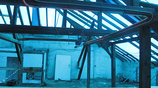 | Obergeschoss des Getreidelagers. Hier werden Vorbereitungen zur kompletten Erneuerung der darüberliegenden Terrassendecke getroffen. | ||||||||