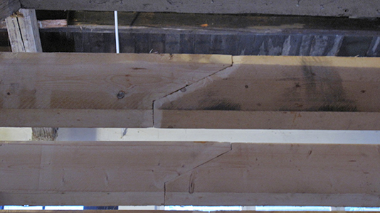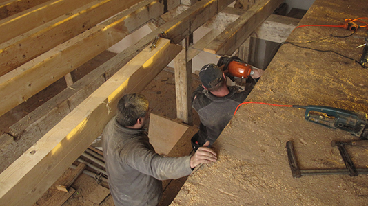 Feinste Zimmermannsarbeit: Erneuerung eines Großteils der Deckenbalken zwischen Erdgeschoss und Obergeschoss des Malzhauses. |