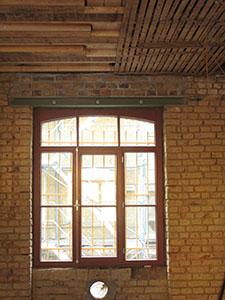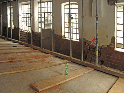 Links: Erdgeschoss des Mühlengebäudes mit neuem Fenstersturz und neuem Fenster. Rechts: Freigelegte und sanierte Geschossdecke im Südflügel, bereit für die Aufnahme einer Dämmschüttung. |
