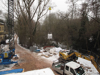 17.01.2017 Der Kran ist aufgebaut. Benötigt wird er für den Materialtransport bei der vollständigen Erneuerung des Malzhaus-Daches und für den Südflügel bzw. Turm. |