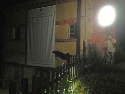 Gemeinsamer Späteinsatz mit dem unermüdlichen Leiter der Tiefbauarbeiten: Testlauf der Sicherheitsbeleuchtung im Eingangsbereich des Künstlervereins. So hell war es nachts in der Walkmühle noch nie! |
