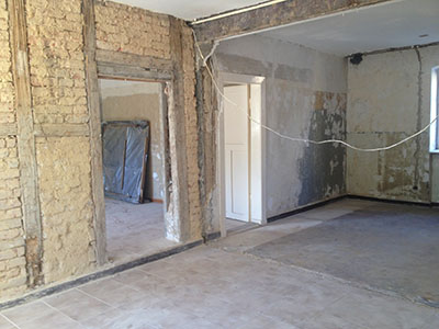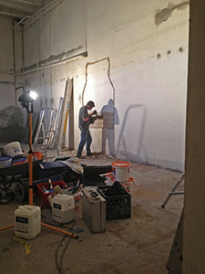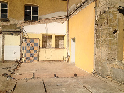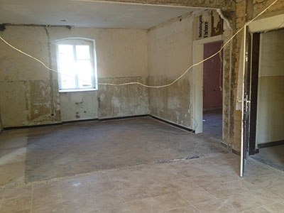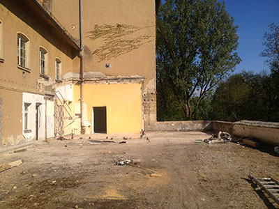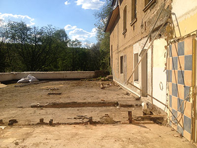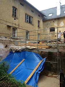 Entkernung im Mühlhaus und Vorbereitung des Betongusses der neuen Terrassendecke im Mühlenhof. |