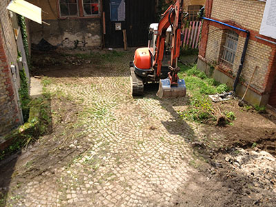 Die Bagger sind in den Eingangsbereich des Künstlervereins vorgerückt und beginnen, die Oberflächenbeläge zu entfernen. Diese Maßnahme bereitet die im Winter und Frühjahr bevorstehenden Tiefbauarbeiten vor, bei denen die gesamte Walkmühle eine neue technische Erschließung (Wasser, Gas, Elektrizität etc.) erhalten wird. |