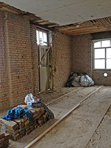 Das entkernte Zwischengeschoss des Südflügels. Zwischenzeitlich wurde es als provisorische und temporäre Unterkunft für in der Walkmühle gastierende Künstler genutzt. |
