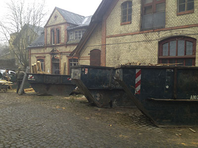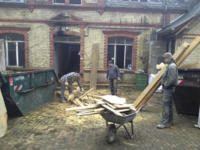 13.12.2013 Während bei uns noch die Ausstellung "Die Kunst zu schenken" läuft, geht es nun in der Walkmühle tatsächlich endlich zur Sache: Große Container sind auf dem Vorplatz des Mühlengebäudes aufgestellt und dort sowie im Dachgeschoss des Pferdestalls beginnt die Entrümpelung und Entkernung ... |