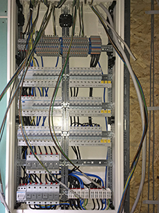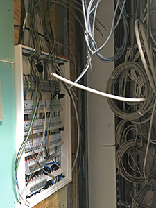 Verdrahtung der Stromversorgung für die zahlreichen Stromschienen, Steckdosen und der Datenleitungen für Audio und Video. |