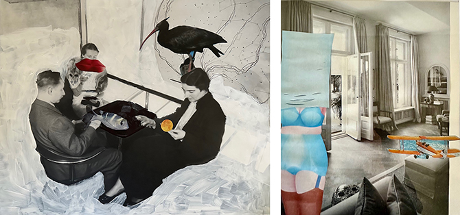 | Links: Andrea Esswein: »Vogelfisch«, Collage auf Papier, 2020. Rechts: »Luftig«, Collage auf Papier, 2021. Beide Fotos © Andrea Esswein, VG Bild-Kunst. |