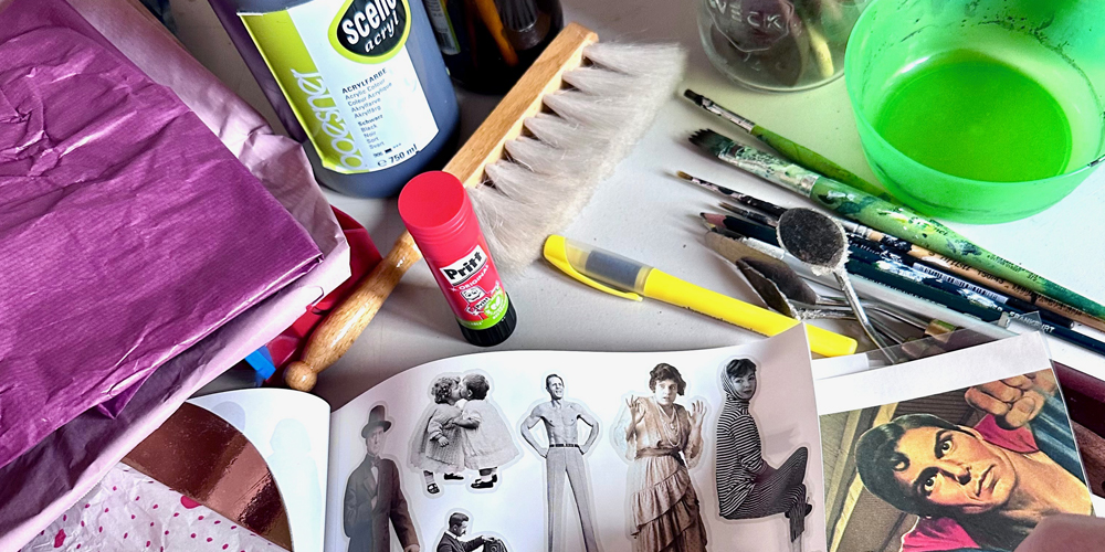 | Workshops 1 + 2 Sa 25. + So 26.10. jeweils 11-15 Uhr: (dieser Termin ist bereits ausgebucht) Sa 8. + So 9.11. jeweils 11-15 Uhr: »Entdecke die faszinierende Welt der Collage Art« – zweitägiger Workshop mit Andrea Esswein. Beschreibung: Willkommen zu meinem inspirierenden Workshop, in dem du spielerisch ohne Vorkenntnisse deine eigene Bildsprache entdecken kannst. In diesem kreativen Raum laden ich dich ein, die faszinierende Welt der Collagen zu entdecken und deine eigene künstlerische Stimme zu finden. Was ist Collage Kunst? Collage ist eine Kunstform, die verschiedene Materialien und Techniken kombiniert, um neue und einzigartige Werke zu schaffen. Ob aus Zeitschriften, Fotos, Stoffen oder anderen Materialien – die Möglichkeiten sind grenzenlos! Du lernst in diesem Workshop alles miteinander zu kombinieren. Was erwartet dich? Einführung in die Collage Technik: Wir beginnen mit einem kurzen Überblick über aktuelle zeitgenössichen Collage Künstler*innen. Materialien und Werkzeuge: Ich bringe Papiere, Vorlagen, Acrylfarben und einige Pinsel mit. Praktische Übungen: Gemeinsam werden wir verschiedene Techniken ausprobieren, um deine Kreativität zu fördern. Du wirst lernen, wie man Farben, Texte und Formen harmonisch kombiniert. Von Anfang an kannst du deine eigene Collage erstellen und im Laufe des Workshop neue Wege finden, wie du einem Thema Ausdruck verleihen kannst. Dein Thema kannst du frei wählen. Ich unterstütze dich dabei gern. Ein Themen Beispiel wäre: »Visionen und Träume – Deine Geschichte in Collagen erzählen«. Durch die kleine Gruppengröße wirst du intensiv beraten. Jeder Teilnehmer erhält die Unterstützung, die er benötigt, um seine künstlerischen Ideen zum Leben zu erwecken. Inspiration durch Gemeinschaft: In einer inspirierten Atmosphäre findet oft Austausch statt. Durch die Gemeinschaft entstehen neue Ideen, und vielleicht wirst du von der Gruppe inspiriert! Egal, ob du eine erfahrene Künstler*innen oder ein absoluter Anfänger bist – dieser Workshop ist für alle, die Spaß am kreativen Schaffen haben und neue Techniken erlernen möchten. Ich freue mich darauf, gemeinsam mit dir in die Welt der Collage-Kunst einzutauchen und kreative Ideen zum Leben zu erwecken. Bring deine Neugier und Freude am Experimentieren mit – ich kümmere mich um den Rest! Workshop-Gebühren: 140,- € pro Person* Maximale Teilnehmerzahl: 5 Personen, Anfänger oder Fortgeschrittene ab 18 Jahre Eine Anmeldung per E-mail ist erforderlich: copygraphy@gmx.de Ort: Atelier Axel Schweppe, Künstlerverein Walkmühle: Walkmühle 5/Bornhofenweg 9 (je nach Navi-System), 65195 Wiesbaden. Bitte beachten Sie, dass ein Parken auf dem Gelände der Walkmühle nicht möglich ist. *Bitte beachten: Bei kurzfristiger Absage fallen Stornierungsgebühren von 50,- € p.P. an. Die Infos zum Workshop mit Andrea Esswein zum –>Download Mehr Infos zu Andrea Esswein: –> www.andrea-esswein.com Instagram: ann_eaty |